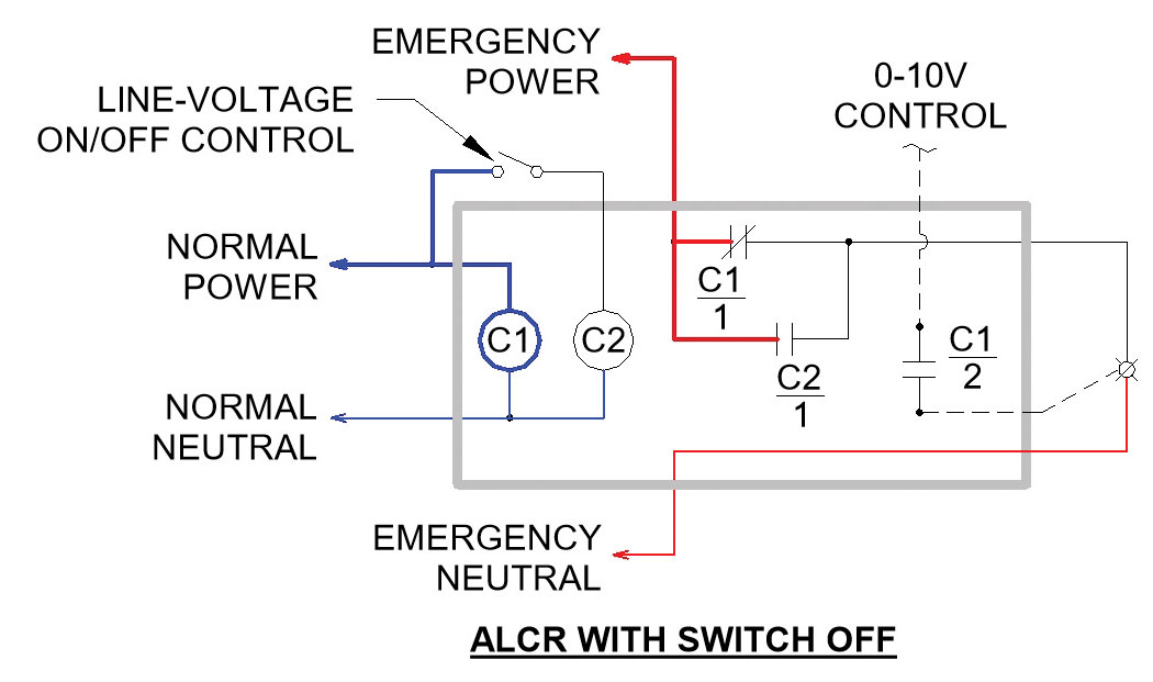 Each manufacturer has its own way to do it, but the schematic diagram in Figure 1 shows the basic function of an Automatic Load Control Relay (ALCR). Note that the luminaire always receives power from the emergency power source. This device is designed to turn the emergency light(s) on at full output if there is an overall power outage in the facility or if the local normal power breaker has been tripped or turned off.
