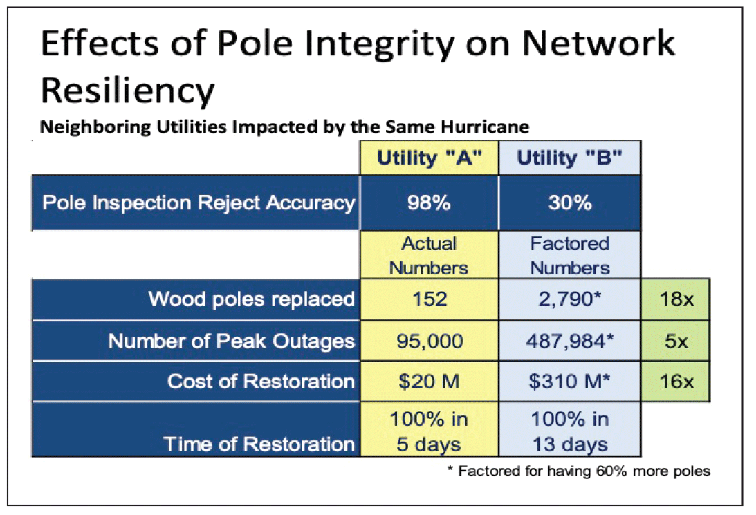 Once installed, structural integrity depends on maintenance. The accompanying Figure 1 illustrates the vast difference in effectiveness between utility maintenance programs for wood poles, as reported by two adjacent utilities after a hurricane. The difference is stark for the number of poles replaced, number of peak outages, the cost of restoration, and time to restoration. The key difference between the two utilities is that one diligently pursued an inspection and groundline maintenance program.