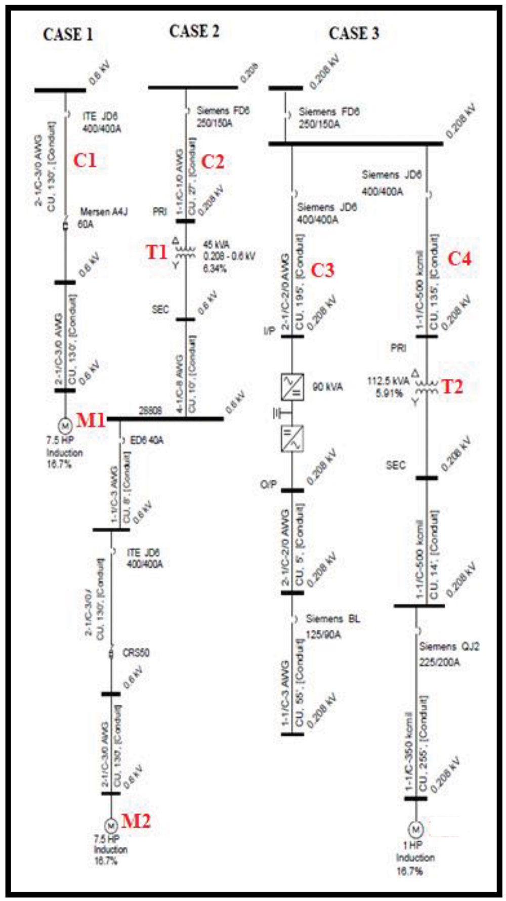 To study the effect of inaccuracy in data collection, three models, namely: Case 1, Case 2, and Case 3 are presented in Figure 7. The system in each model is built and simulated using EasyPower (V10).