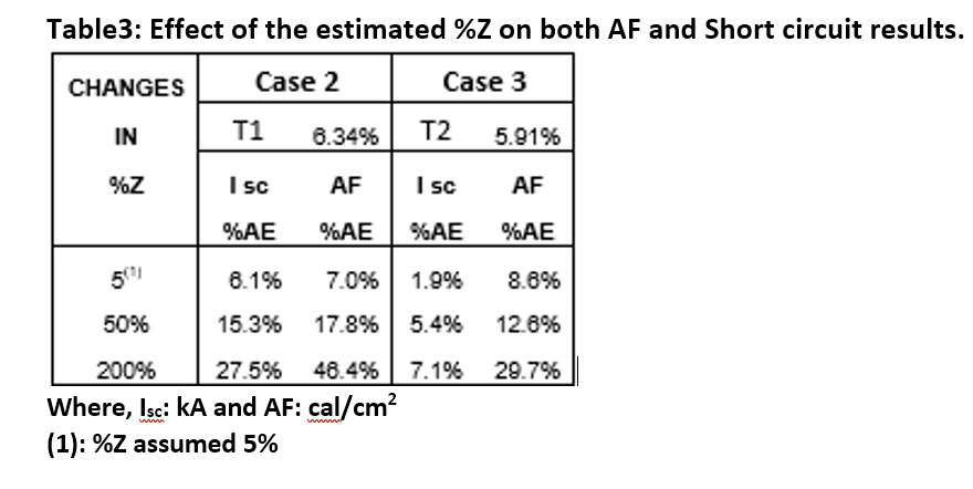 Usually, these values should be printed on the nameplate, but it is not always the case, as shown earlier in Figure 1. While one approach is calling the manufacturer to obtain these values, it is been proven that this practice can cause excessive delays and add extra inaccuracy in some cases. Another used approach in the industry is to approximate the value to 5%. Table 3 shows how varying the value for %Z can affect both Short Circuit and Arc Flash levels on different buses. Note that, in the three cases, using a value of 5% would generate a lower %error.