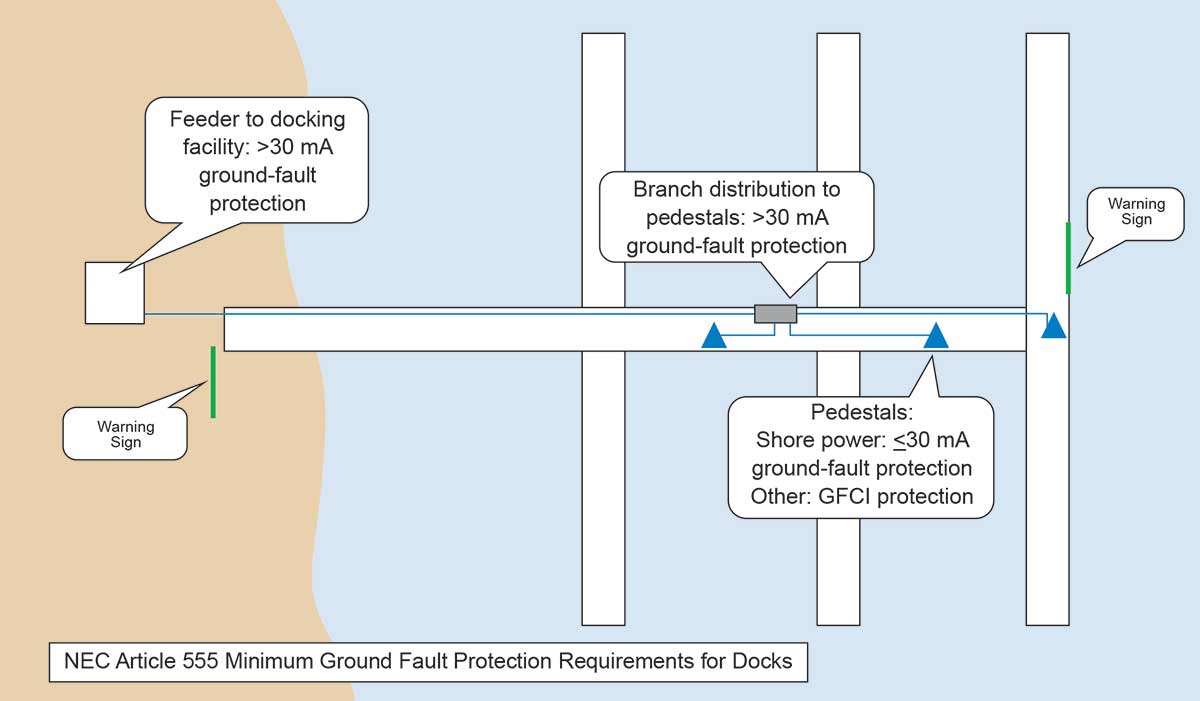 In addition to the enhanced ground-fault protection of the 2017 edition, the NEC also requires permanent signage warning about the danger of electrically energized water near a boat dock or marina. The signs must state, “WARNING—POTENTIAL SHOCK HAZARD—ELECTRICAL CURRENTS MAY BE PRESENT IN THE WATER” and the sign must be visible from all approaches to a marina or boatyard, per Section 555.24.