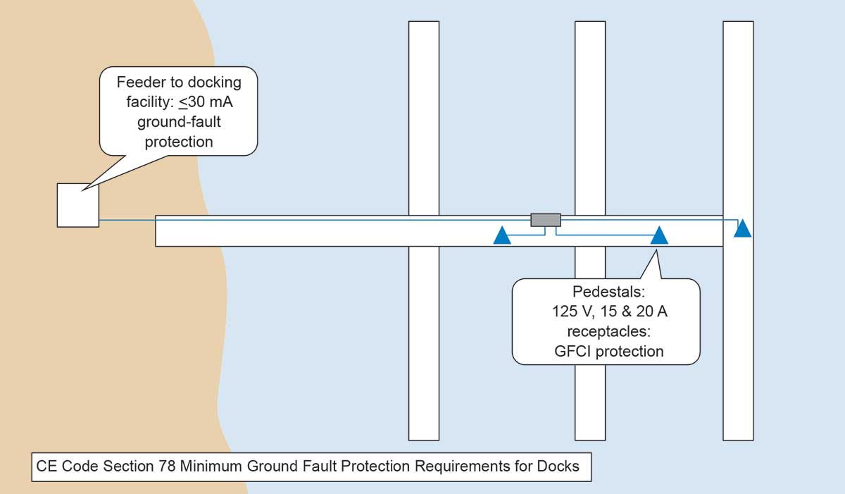 CE Code Section 78 was extensively re-written for the 2018 edition. This includes new definitions for boathouse, docking facility, fixed and floating piers, and marine wharf. Ground-fault protection rules include Class A GFCI protection for 125-volt, 15- and 20-ampere receptacles located outdoors on piers, docking facilities, wharves, and boathouses. Each shore-power receptacle must be supplied by its own branch circuit. For circuits not required to be GFCI protected, each feeder for distribution equipment in or on a pier, docking facility, or boathouse must have ground-fault protection at a level not greater than 30 mA. Feeder voltage is not mentioned (see figure 3).