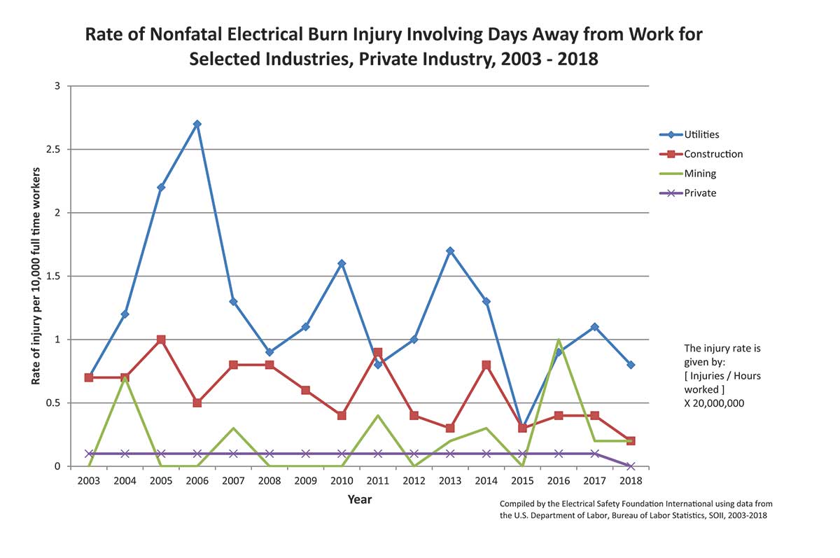 In 2018, 0.17% of all nonfatal injuries resulting in days away from work could be attributed to electricity. In 2017, 0.25% could be attributed to electricity. The median number of days away from work for nonfatal electrical injuries was four in 2018, a 60% drop from 2017, returning to 2014 levels.