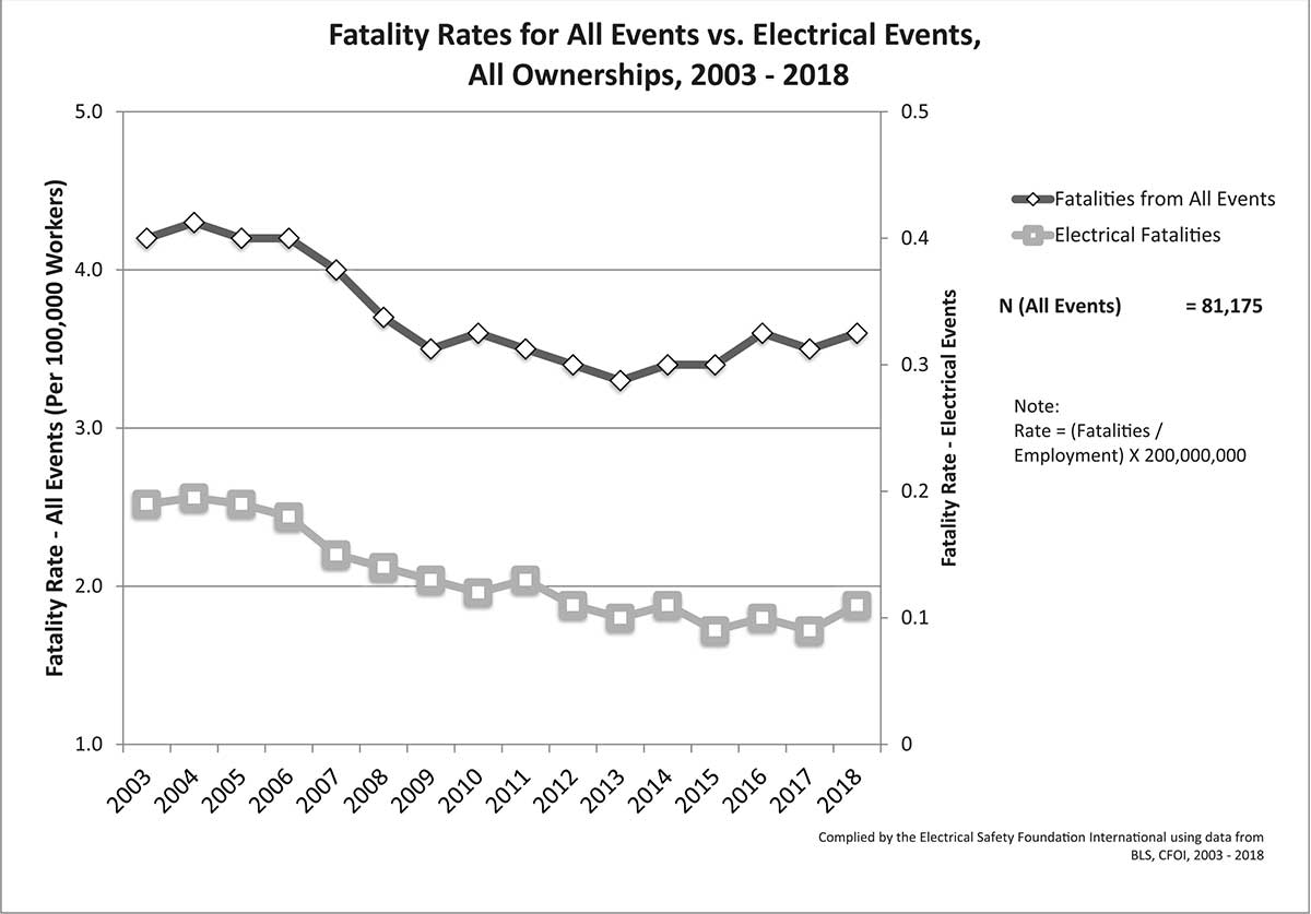 Contact with or exposure to electric current accounted for 3% of all fatalities in 2018.