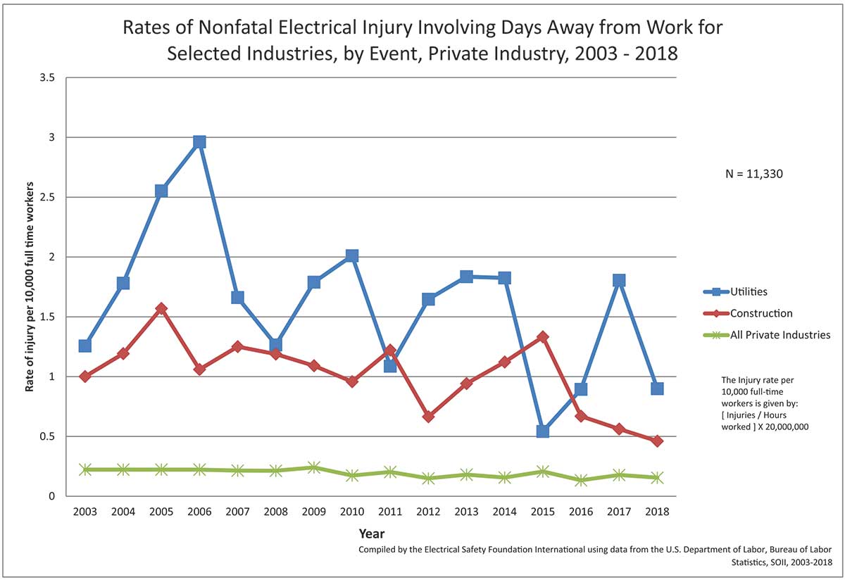 While year-over-year fatal injuries increased, only 3% were caused by contact with or exposure to electricity. Since nonfatal injuries were at a record low, the median number of days away from work due to the electrical injury was reduced to four. Previously in 2003-2017, that number was 10.