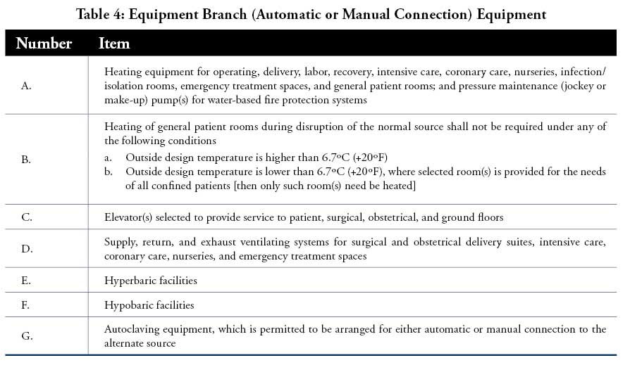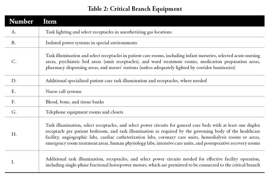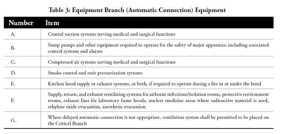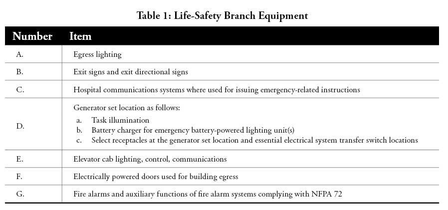 The life-safety branch is the most important and given highest priority. Table 1–Table 4 detail the equipment that emergency power must support in each branch.