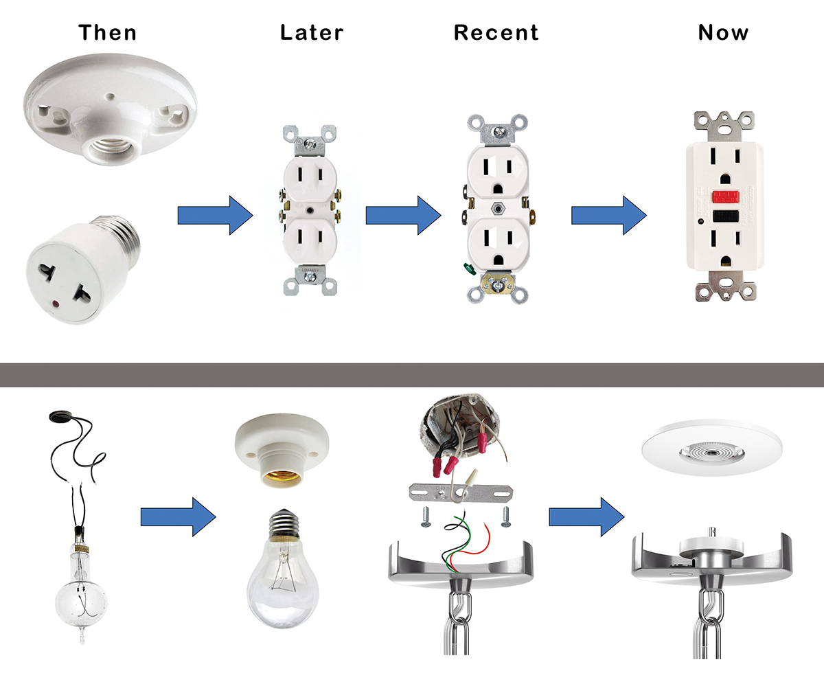 In the 1962 edition, the requirements were moved to Section 210-21(b) and made it mandatory that all 15- and 20-ampere receptacles on branch circuits have to be the grounded-type device. From the grounding-type receptacle, the evolution has now come to the ground-fault circuit interrupter (GFCI) receptacle that not only provides the advantages of a grounding and bonding connection, but a protection means when a low-level ground fault occurs. The result of these technology changes and mandatory Code requirements have been documented to have greatly reduced incidents of electrical shocks and injuries even with the increased use of electrical appliances and equipment, see figure 2. There are many other examples where technology was developed to mitigate a hazard and that technology becoming part of the Code. As we continue to evolve, more new technologies are being introduced or expanded in application.