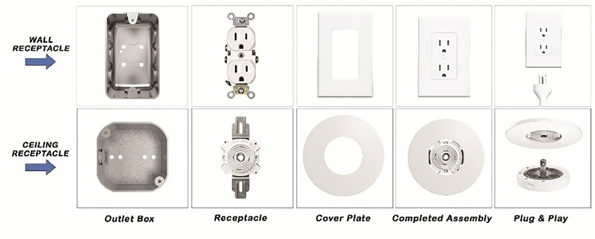 When looking around the home, most electrical equipment advanced from some level of hard-wired connection to essentially “plug and play”: appliances plugging into a receptacle, landline phone, home internet, and satellite TV. Why not for ceiling luminaires and paddle fans? Again, because the technology to bear the weight didn’t exist before, but now does exist, see Figure 6. Figure 7 shows the comparison of concepts – the installation of a grounding-type receptacle in a wall box and the similar installation of the weight supporting ceiling receptacle in a ceiling box.