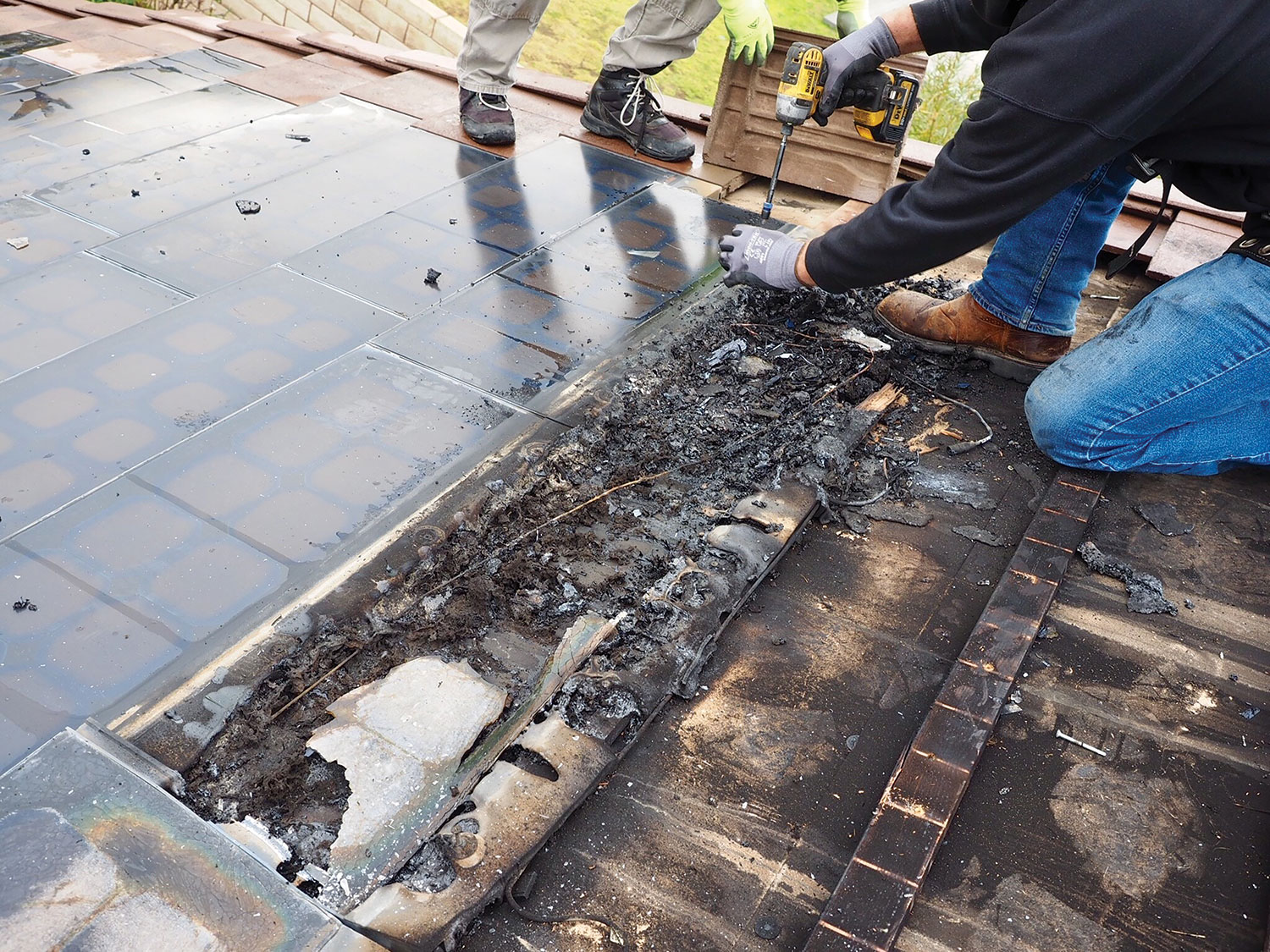 The fire was contained to a section of a $60,000 building-integrated PV (BIPV) system on the roof. The modules were attached to the roof sheathing in a manner that would match the tiles on the rest of the roof. While the fire appeared to be contained to a portion of the PV system, there was some damage to the roof sheathing and underlayment under the portion of the BIPV array where the fire occurred.