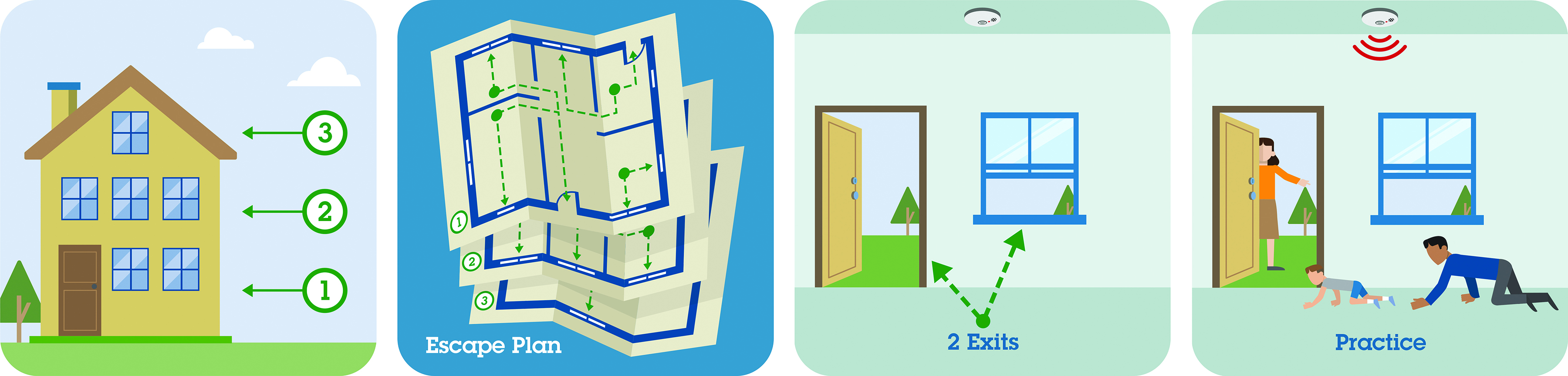 Make a home escape plan. Draw a map of each level of your home. Show all doors and windows. Go to each room and point to the two ways out. Practice the plan with everyone in your household.