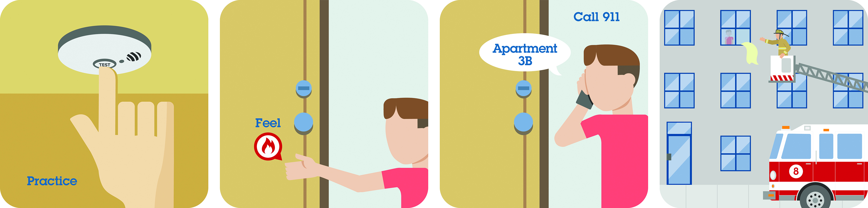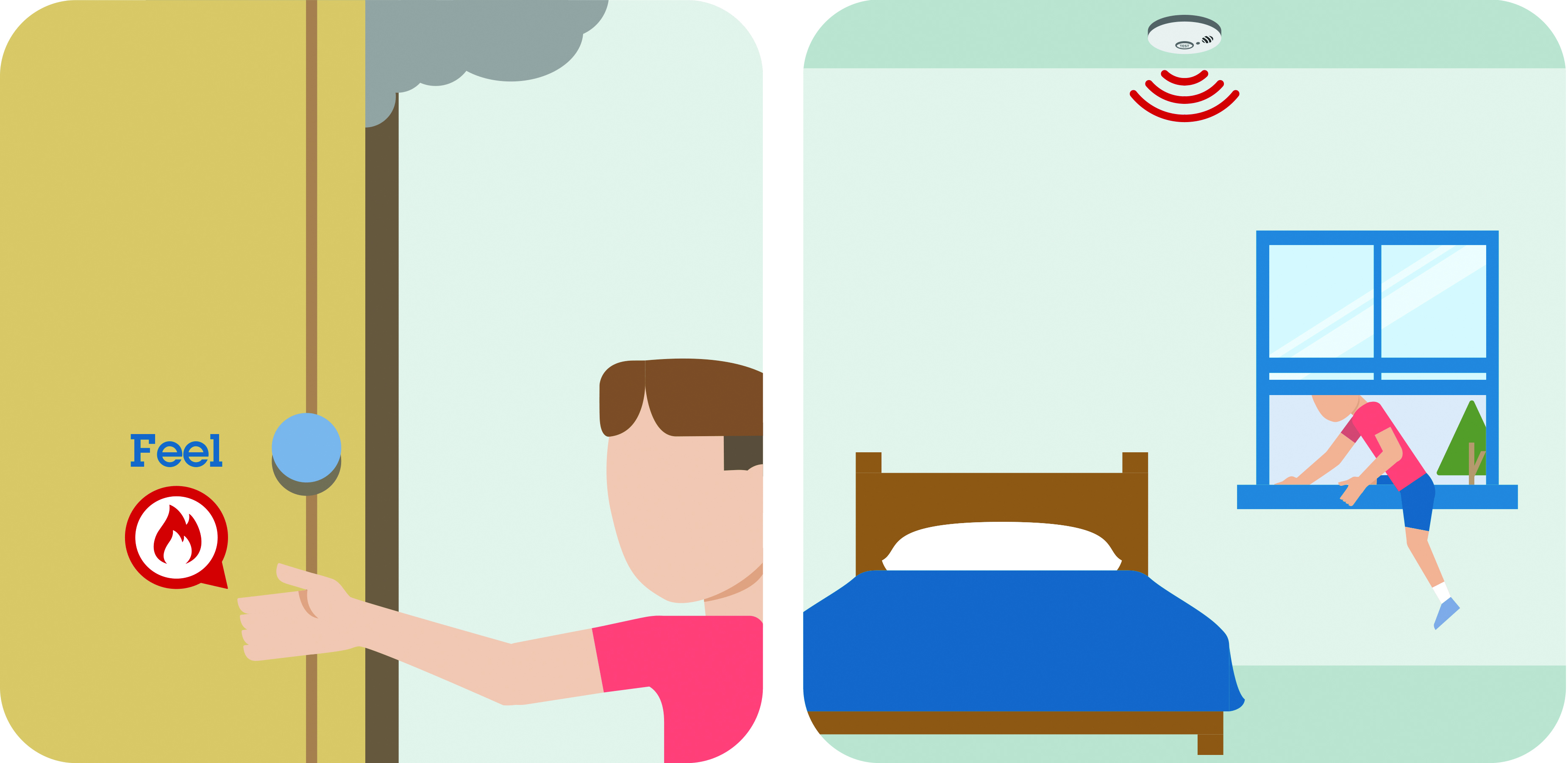 Practice what to do if the door feels hot. Call 911. Place a cloth outside your window to let firefighters know you are still inside.