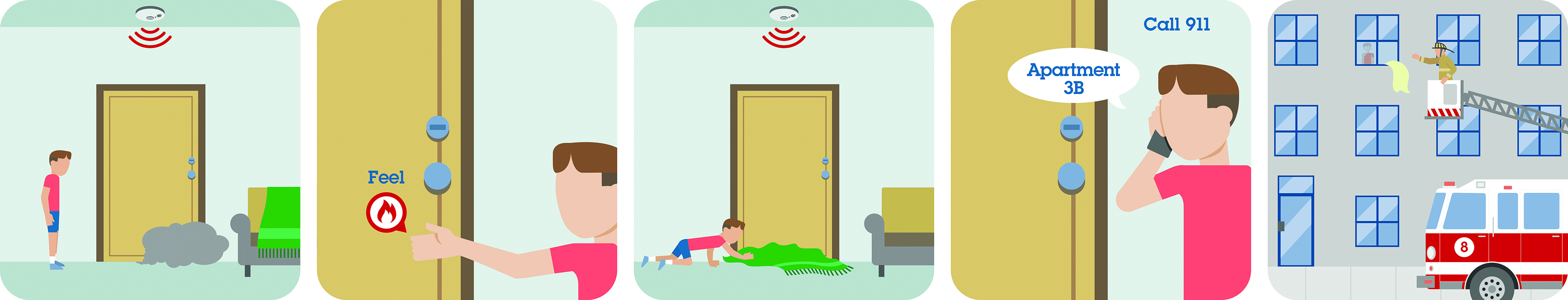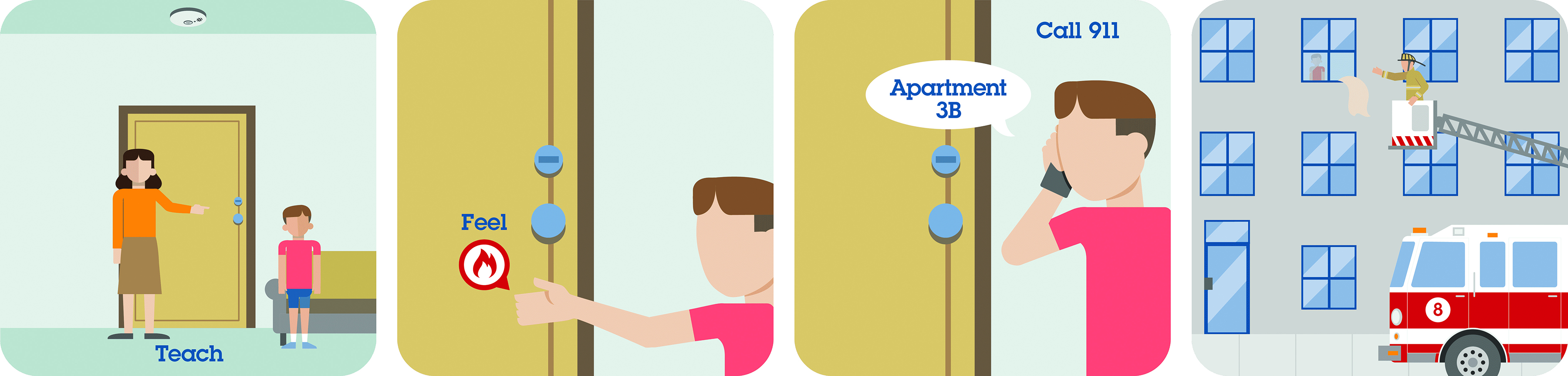 Teach them to feel the door before escaping. If the door feels warm, or if there is smoke on the other side, they should stay inside and call the fire department from the apartment. Teach them to signal for help at the window with a light-colored cloth or a flashlight.