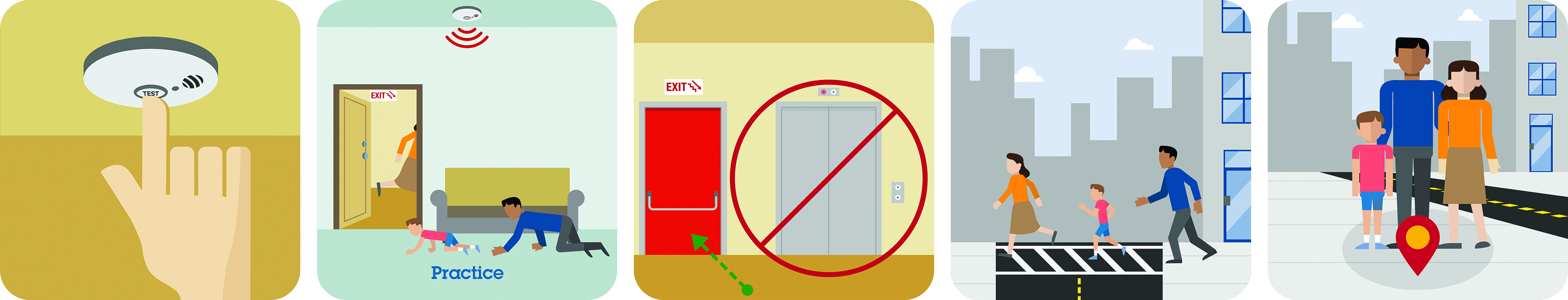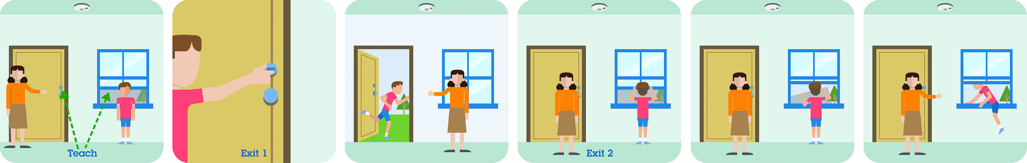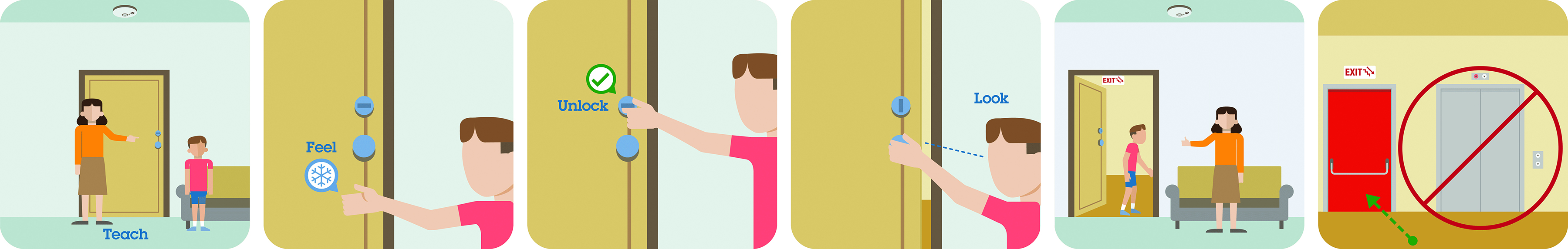 They must use the stairs to escape, not the elevator. Teach them to feel the door before escaping. If the door feels cool, unlock the door and check outside. Practice using the exit stairs.