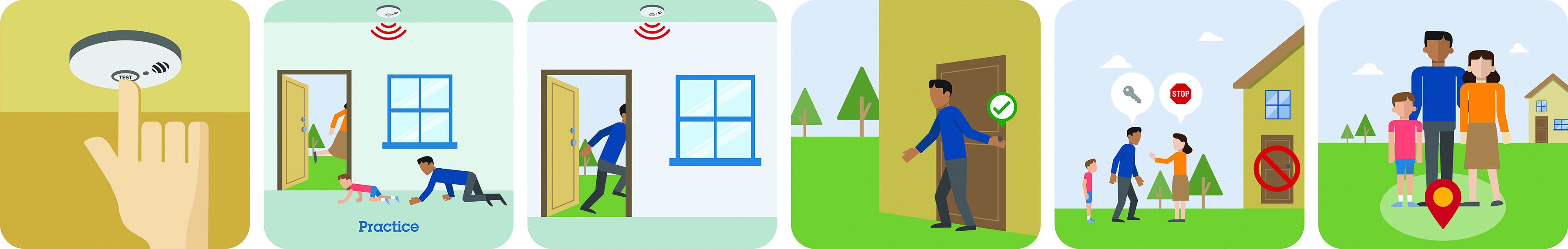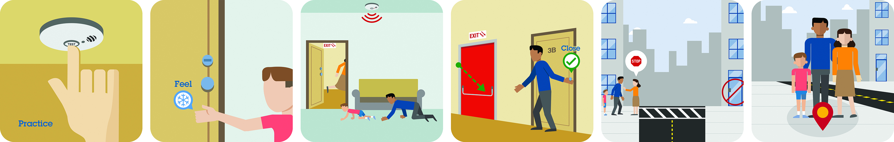 Practice what to do if the door feels cool. Close doors behind you as you leave. Use the exit stairs to get out and stay out. Never go back inside. Go to your outside meeting place.