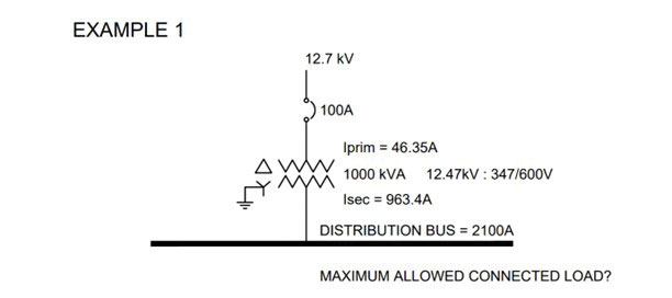 And what about maximum load allowed to be connected to the transformer secondary? It depends whether the 100 A circuit breaker is marked for continuous operation at 100% or at 80% of the ampere rating of its overcurrent devices. If it is marked for 100%, then the maximum allowed connected load is 2080 A. However, if the circuit breaker is marked continuous operation at 80%, then the maximum allowed connected load cannot exceed 2080 x 0.8 = 1664 A. It is interesting to note that in both these cases, the ampacity of connected load is allowed to be higher than the rated secondary current of 963.4 A. It means that if the circuit breaker is marked for continuous operation at 100%, then in accordance with Rule 8-104, the transformer can be loaded by 2080: 963.4 or by 2.16 times higher than the transformer-rated secondary current. If, however, the circuit breaker is marked for continuous operation at 80%, then in accordance with Rule 8-104, the transformer can be loaded by 1664 A: 963.4A or by 1.72 times higher than the transformer rated secondary current. Of course, the transformer manufacturer should be also consulted in this regard from the perspective of design, construction and testing of each specific type of transformer.