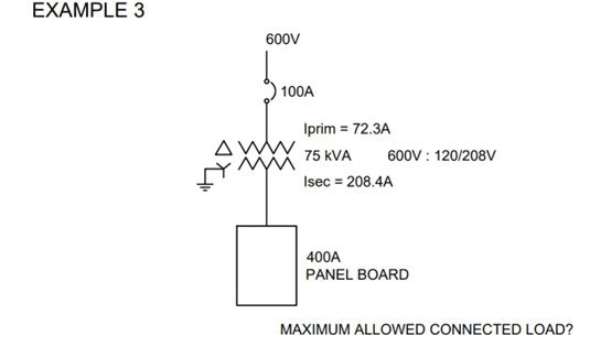 However, if the circuit breaker is marked continuous operation at 80%, then the maximum allowed connected load cannot exceed 288 x 0.8 = 230.4 A. It is interesting to note that in both these cases (similarly to example 1), ampacity of connected load is allowed to be higher than the rated secondary current of 208.4 A. It means that if the circuit breaker is marked for continuous operation at 100%, then in accordance with Rule 8-104, the transformer can be loaded by 288A : 208.4A or by 1.38 times higher than the transformer rated secondary current. If, however, the circuit breaker is marked for continuous operation at 80%, then in accordance with Rule 8-104, the transformer can be loaded by 230.4A: 208.4A or by 1.11 times higher than the transformer rated secondary current.