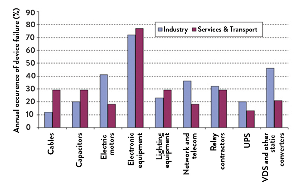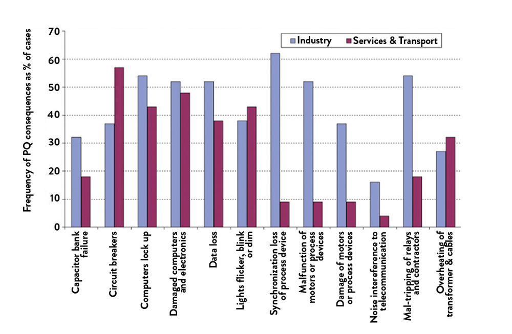 Figure 2 illustrates other common scenarios in which power quality (PQ) studies should be considered represented as a percentage of likelihood to happen. These scenarios range from frequent electrical disturbances or power outages that disrupt critical equipment and processes to the use of sensitive electronic devices such as medical or manufacturing equipment that require a reliable and consistent power supply. Other situations that necessitate PQ studies include being connected to an electrical grid with a history of poor PQ, which may involve voltage sags, swells, transients, or harmonics. PQ studies may also be required after a significant renovation or expansion that alters the electrical load profile, ensuring that the existing electrical infrastructure can support the new load. Lastly, being in an area susceptible to PQ problems, such as experiencing high levels of electromagnetic interference (EMI) from neighboring industrial facilities or being prone to lightning strikes, may also warrant PQ studies.