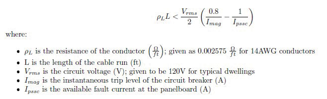Taking the above value for Imag, let’s move on to the length of the home run. This variable already has an approved value of 50 feet (for 14AWG cable) in NEC sections 210.12(3)(b) and 210.12(4)(b). We will use this value in our calculations.