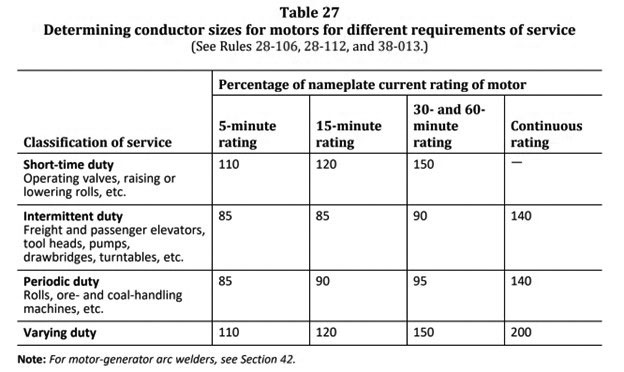 2) The insulated conductors of a branch circuit supplying a motor for use on non-continuous duty service shall have an ampacity not less than the current value obtained by multiplying the full load current rating of the motor by the applicable percentage given in Table 27 for the duty involved, or for varying duty service where a deviation has been allowed in accordance with Rule 2-030 by a percentage less than that specified in Table 27.”