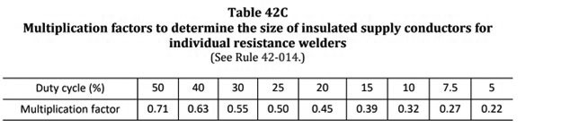 c) where an individual resistance welder operates at known and constant values of actual primary current and duty cycle, the insulated supply conductors shall have an ampacity of not less than the value obtained by multiplying the actual primary current by the applicable factor from Table 42C; and