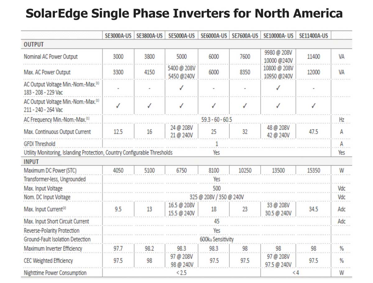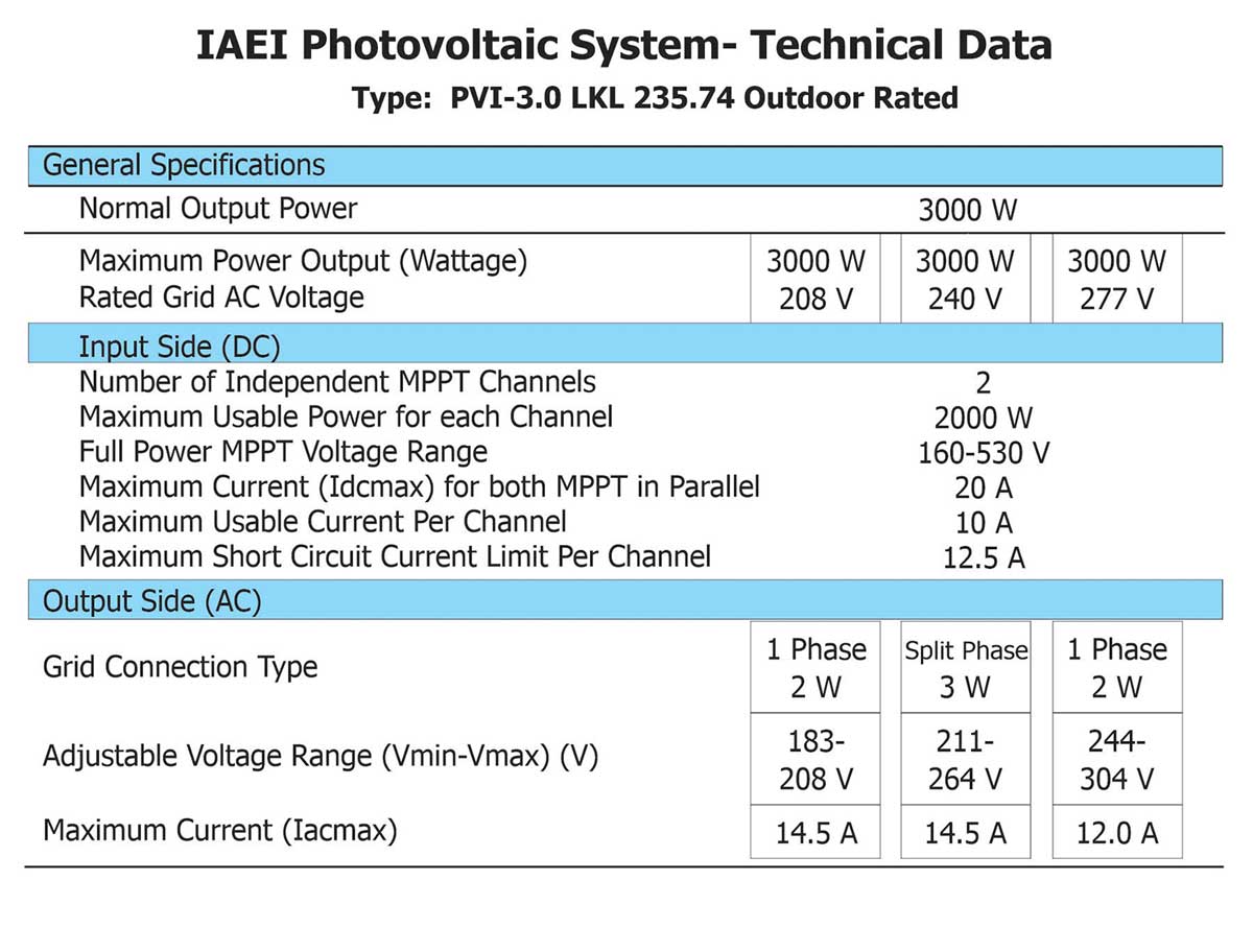 Figure 5 provides an example of a typical inverter datasheet. A key element of the datasheet is the inverter rating (kW). The normal output power is indicated as 3000 watts (3 kW) and the inverter can be interconnected to a 208, 240, or 277-volt premises distribution system. The output current may differ based on the system voltage, so be sure to reference the correct column.