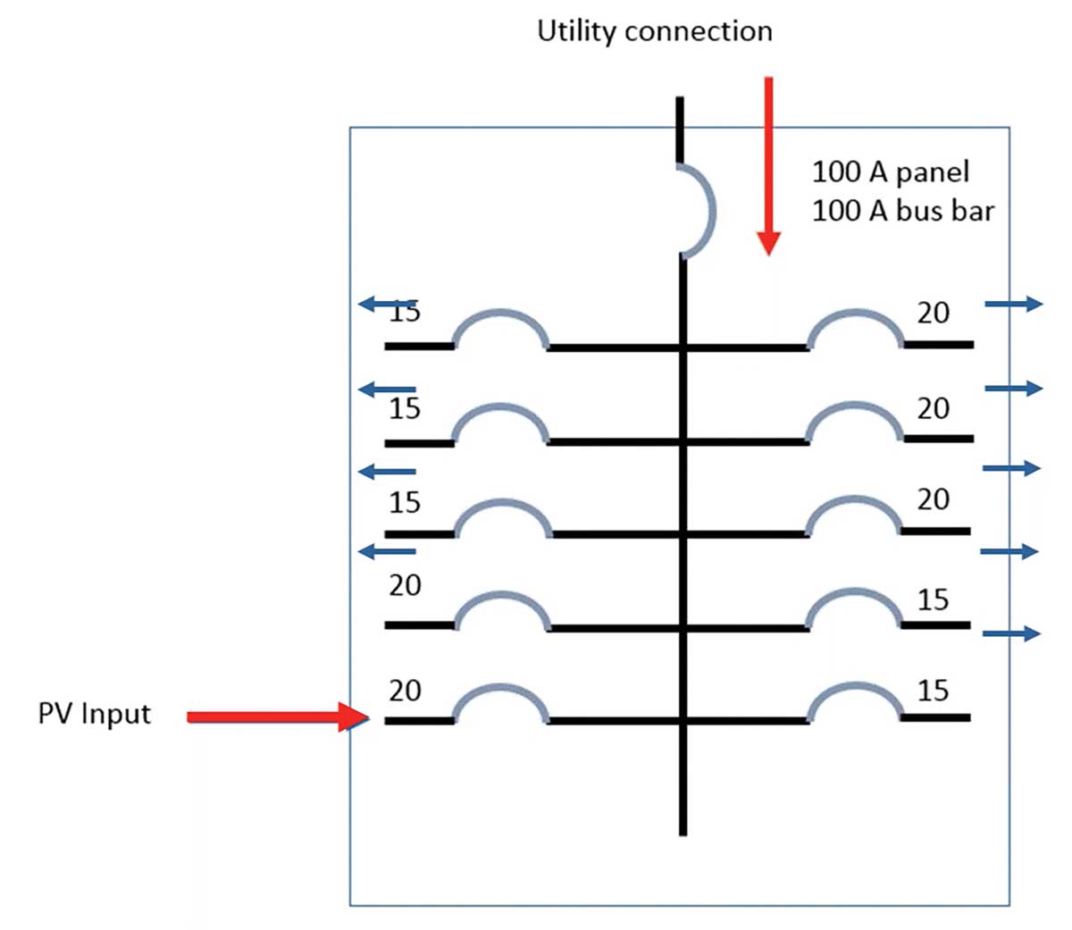 Figure 8 provides an illustration of the concept. The PV system inverter is a supply to the panelboard along with the utility. The utility supply is limited by the 100-ampere main circuit breaker at the top and the PV system supply is limited by the 20-ampere circuit breaker at the bottom. Both the PV input and the utility connection are supplies. What limits ampacity on this 100-ampere rated bus bar? The utility and PV system overcurrent devices provide the necessary limitation.