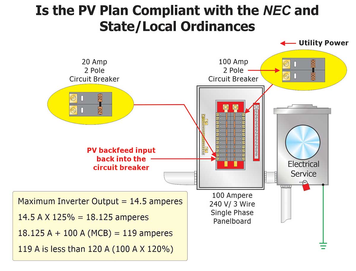 Figure 9 puts the math into action. The 100-ampere panelboard equipped with a 100-ampere main circuit breaker is allowed 120 amperes from all sources (100 amperes x 120%). What does the Figure 4 system indicate? There is an 18.125-ampere continuous output current from the inverter to the panelboard. Since 118 amperes is less than the 120 amperes (100 A x 120%) permitted maximum, the design is code compliant.