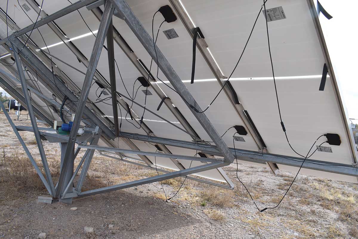 At the cold temperature of -19°C, the change in temperature of 25 to -19 is 44 °C. Applying the -0.14V/°C temperature coefficient yields an increase in voltage of 6.16 volts for a cold-weather module voltage at the peak power point of 50.1 + 6.16 = 56.26 volts. With 17 modules in series, the source circuit voltage would be 17 x 56.26 = 956.42 volts. This peak power voltage range of 720.8 to 956.4 volts slightly exceeds the range of the inverter, which is 375 to 950 volts. In the very unlikely event that a high wind condition should occur at this record low-temperature event, only a small amount of power would be lost. In most cases, lesser winds would result in solar heating of the modules and a lower peak or max power voltage thereby allowing proper peak power tracking to occur.