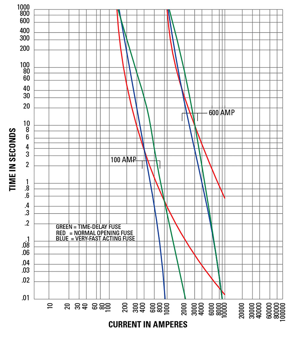 As discussed earlier in the Fuseology Fundamentals section, time-delay, fast-acting, and very fast-acting fuses all respond differently based on the overcurrents occurring in the systems each is protecting. To illustrate the basic differences between each type of fuse, figure 2 compares the average melting times for 100 and 600 amp ratings of three fuse types: Littelfuse dual-element, time-delay LLSRK series class RK1 fuses (green); Littelfuse normal opening NLS series class K5 fuses (red); and Littelfuse very fast acting L60S series semiconductor fuses (blue). To better illustrate this point, Table 1 also compares the opening times for each of these fuses.