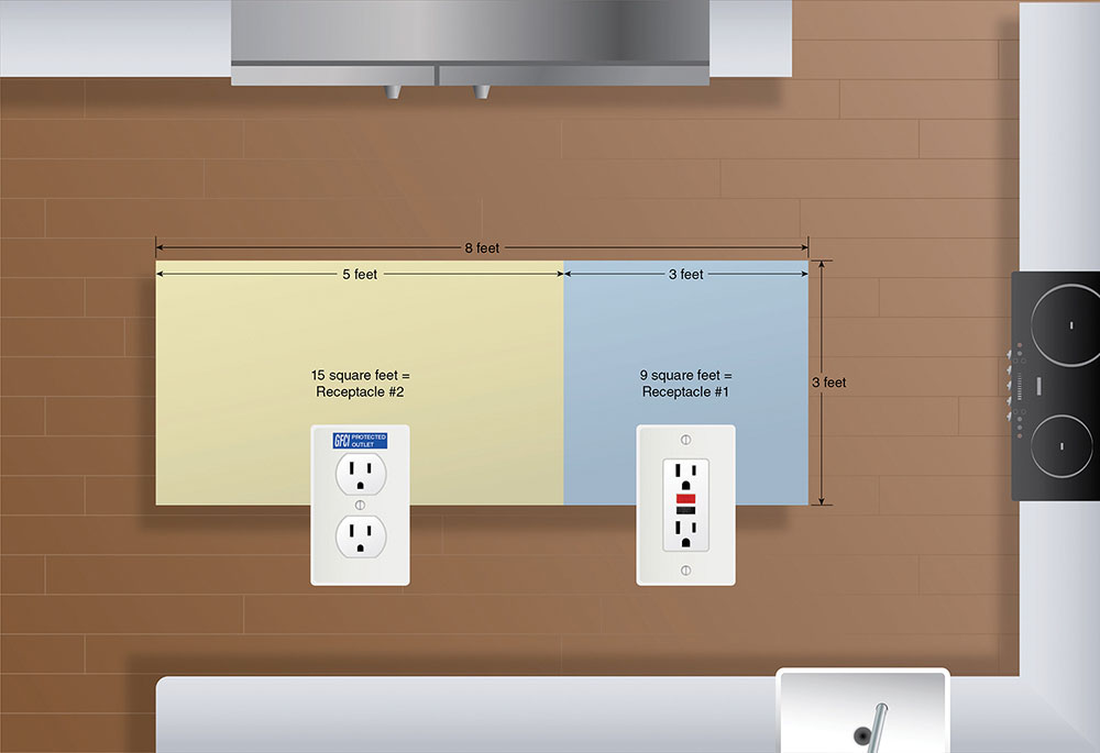 - Kitchen island receptacle requirements also saw a major overhaul during the 2020 NEC revision cycle. In prior versions of the NEC, Section 210.52(C)(2) required that at least one receptacle be installed within a kitchen island that had a countertop with a long dimension of 24 inches or greater and a short dimension of 12 inches or greater. Within the same section of the 2020 NEC, it has been revised to require at least one receptacle within the first nine square feet or fraction thereof, of an island countertop and an additional receptacle for every 18 square feet more or fraction thereof. An additional requirement states that at least one receptacle shall be located within two feet of the outer end of a peninsula countertop. The example picture below shows how a 9 ½ foot by 3-foot island countertop will now require three total receptacles to meet the new requirements.